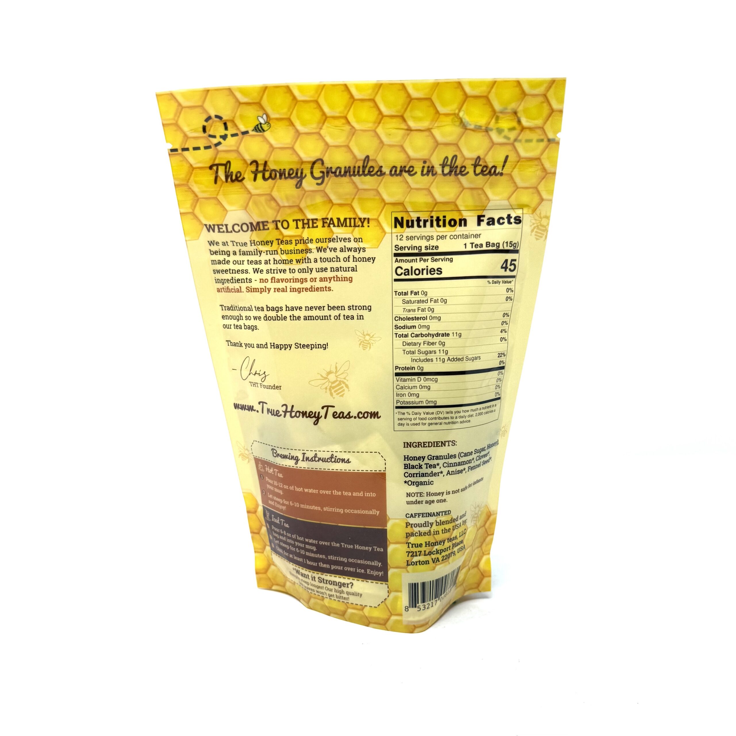 Ingredients: Honey Granules (Cane Sugar, Honey), Organic Assam Black Tea, Cinnamon, Cloves, Coriander, Anise, Fennel
